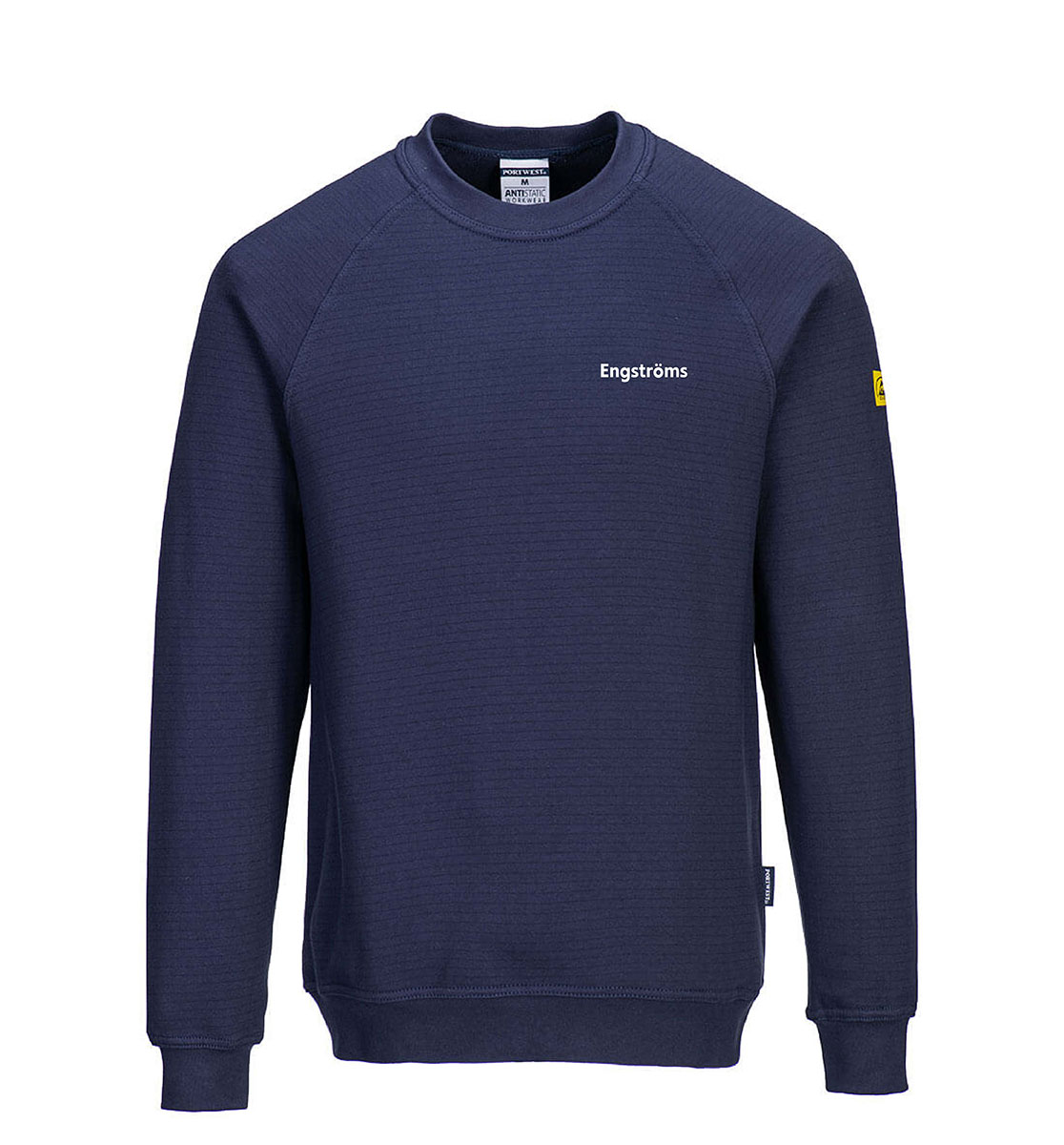 En bekväm ESD sweatshirt som minskar risken för elektrostatisk uppladdning. Kolfiber vävt genom tyget. Ribbad mudd vid handleden, marinblå.