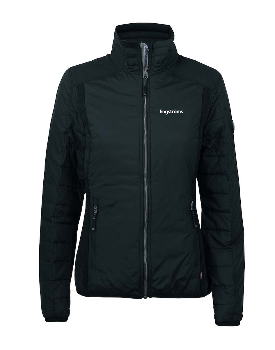 Jackan är utrustad med dragkedjsfickor och elastiskt kantband som drar till nedtill och i ärm samt stänger ute kyla.